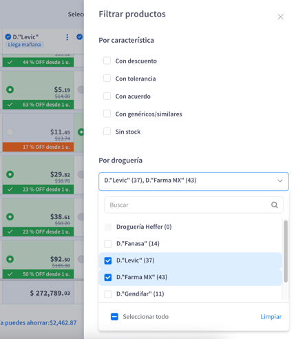 Permite enfocarse únicamente en los productos de una o varias droguerías. -